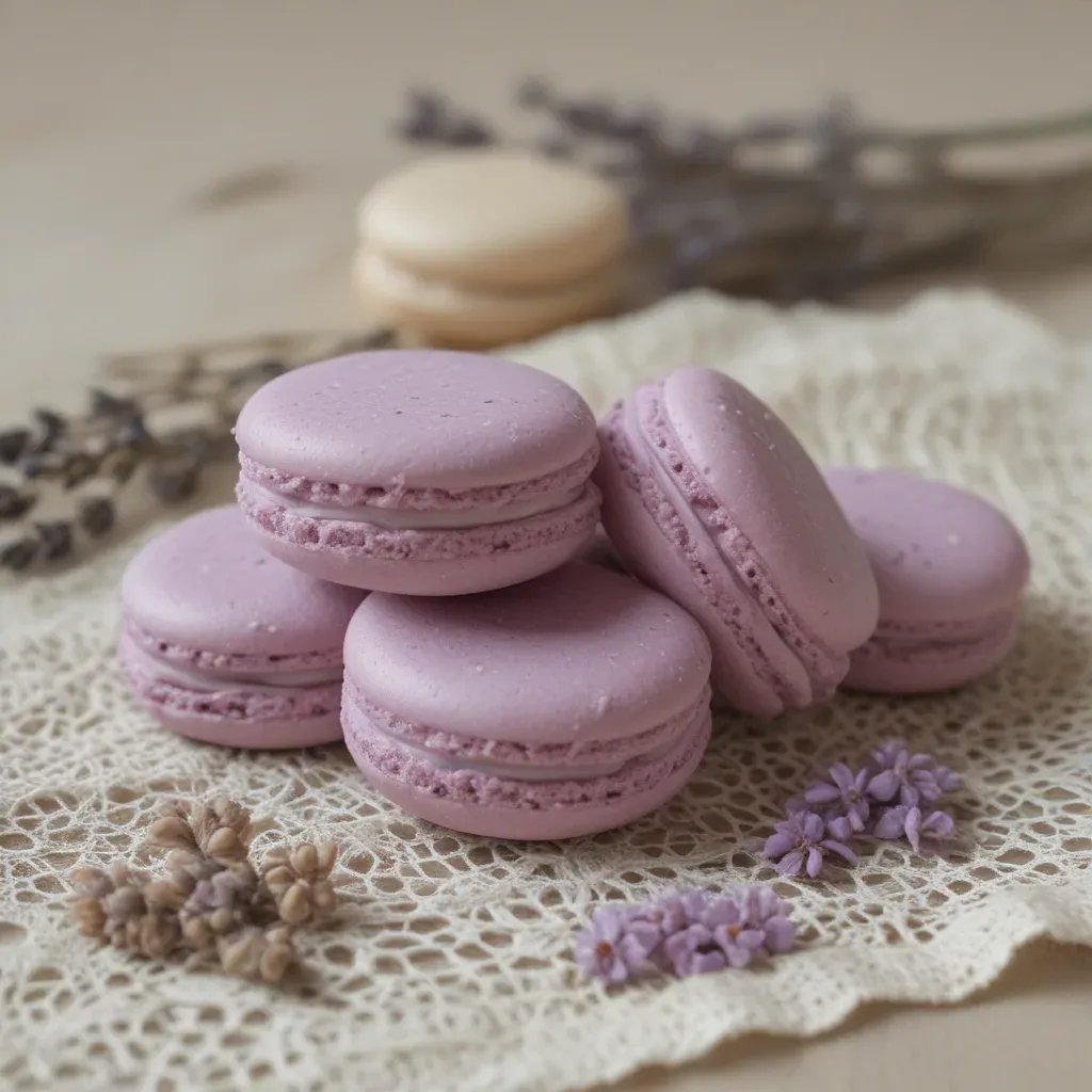 Soft lavender macarons with a glossy finish rest on a delicate lace doily, surrounded by muted purple dried lavender sprigs, creating a serene and elegant presentation. The warm, diffused lighting highlights the macarons' smooth texture and shallow depth of field enhances the focus on the foreground macarons, leaving ample copy space for text.