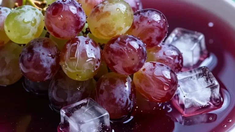 Glossy grapes and translucent ice cubes rest in a vibrant red liquid, illuminated by direct overhead light that highlights their textures and reflections. The blurred background emphasizes the foreground elements, creating a shallow depth of field ideal for product photography.