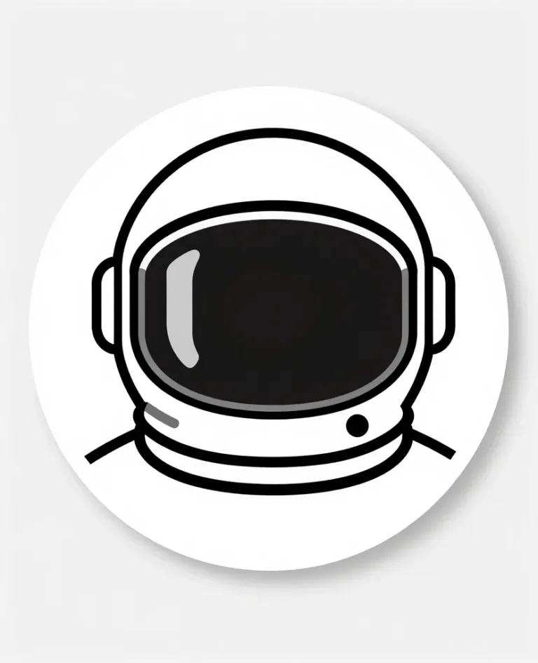 A minimalist astronaut helmet icon with a glossy black visor and white background, illuminated by soft, diffused light from above, creating subtle highlights and shadows on the helmet's surface. The clean, symmetrical design with ample copy space makes it ideal for branding and digital interfaces.