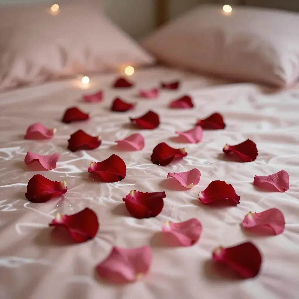 Soft pink and deep red rose petals are artfully arranged in a linear pathway on a silky, glossy bedspread, illuminated by warm, ambient light from out-of-focus lights, creating a dreamy and intimate atmosphere. The shallow depth of field draws attention to the delicate petals, while the soft glow enhances the romantic mood.
