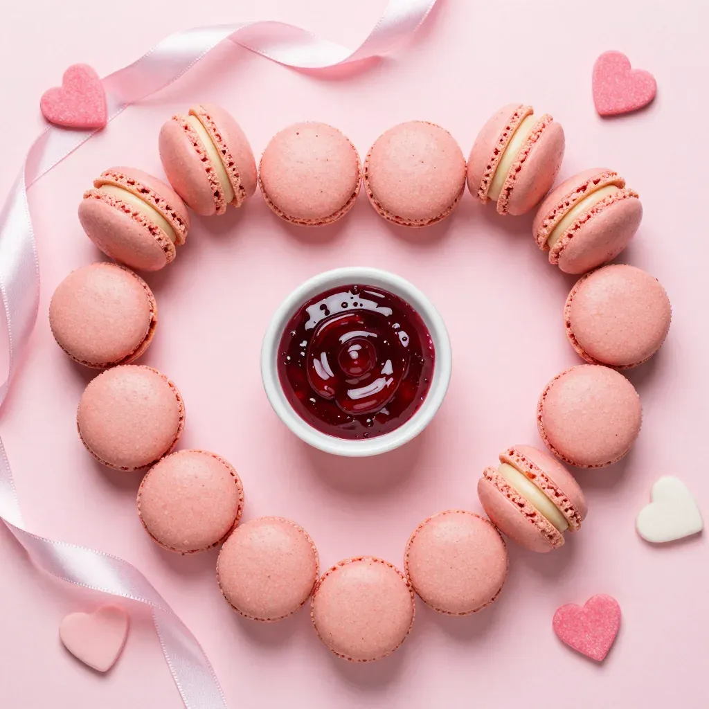 A heart-shaped arrangement of smooth pink macarons surrounding a glossy red jam, with soft diffused lighting creating gentle highlights and shadows. The slightly blurred background ensures the heart shape remains the primary focus, adding a romantic and whimsical touch.