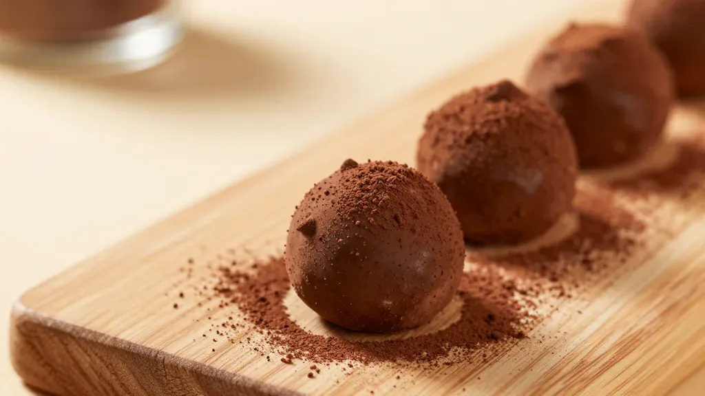 A close-up of chocolate truffles dusted with cocoa powder, arranged in a straight row on a rustic wooden board, with warm ambient lighting enhancing their texture and deep chocolate tones against a blurred beige background.