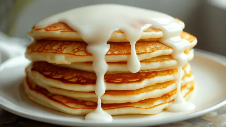A close-up of a stack of golden pancakes topped with glossy coconut cream glaze, illuminated by warm, overhead light that highlights the texture and creates a shallow depth of field, keeping the focus on the pancakes against a blurred, neutral background.