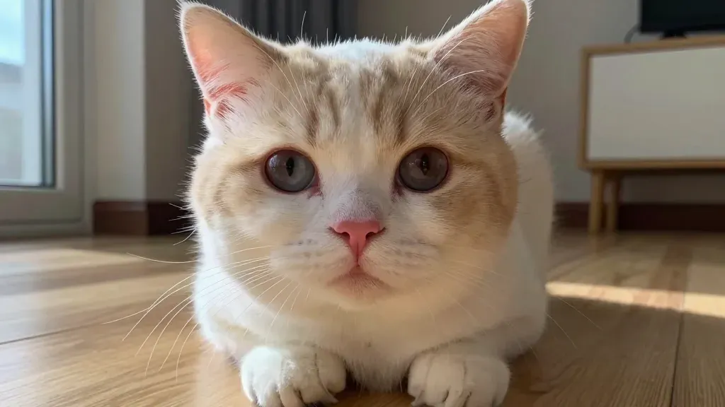 A close-up of a fluffy, light-colored cat with green eyes, gazing directly at the camera with soft, plush fur and delicate paws. The warm, natural light from a nearby window highlights the cat's features, creating a serene and inviting atmosphere.