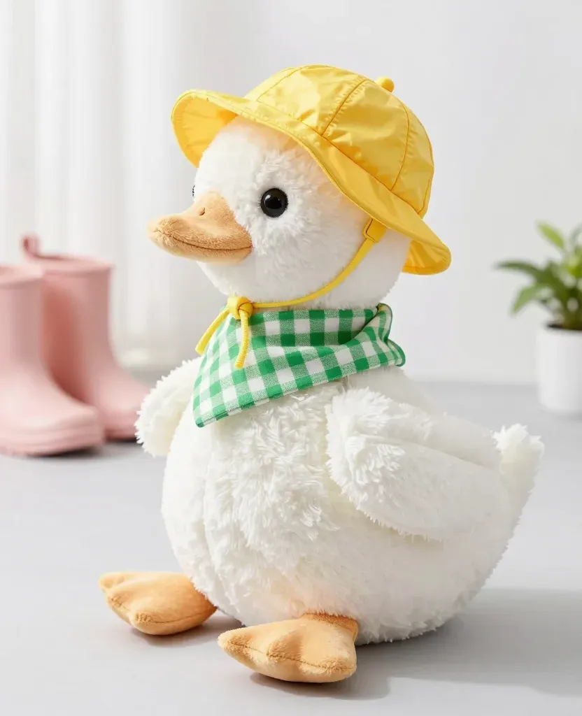 A soft, plush duck adorned with a glossy yellow hat and a green checkered scarf, illuminated by diffused, soft light that highlights its features and creates gentle shadows. The shallow depth of field and blurred background with pink rubber boots and a potted plant suggest a cozy indoor setting.