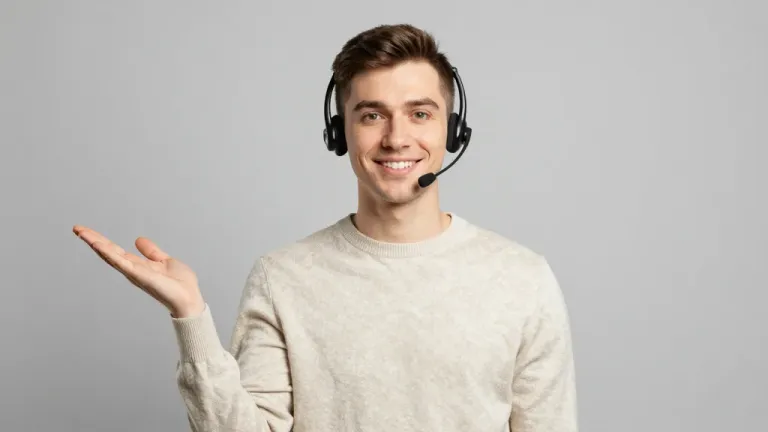 A young man wearing a headset and a light beige sweater extends his hands outstretched, inviting interaction. The soft, even lighting and neutral background create a welcoming atmosphere, emphasizing the subject's approachable demeanor.