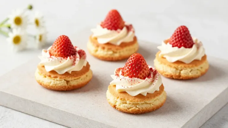 Golden-brown shortcake bases topped with creamy whipped cream and glossy strawberries, softly lit to highlight textures and colors. The shallow depth of field and soft white background with delicate daisies emphasize the desserts, offering ample copy space.