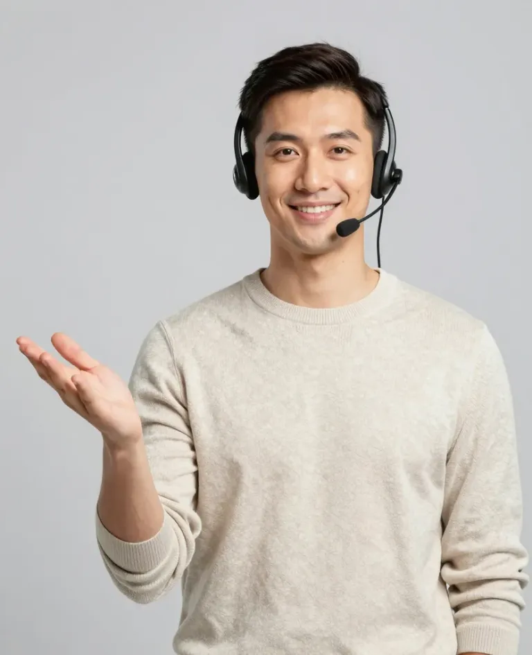 A man in a beige sweater gestures with his hand while wearing a headset, illuminated by soft, diffused light from above. The plain, light gray background ensures the subject remains the focal point.