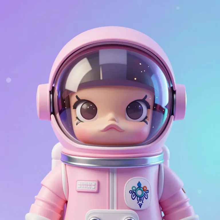An adorable astronaut in a pastel pink space suit, with glossy helmet and soft fabric, bathed in diffused light that creates gentle highlights and reflections. The gradient background of soft purples and blues slightly blurs to emphasize the subject, offering ample copy space.
