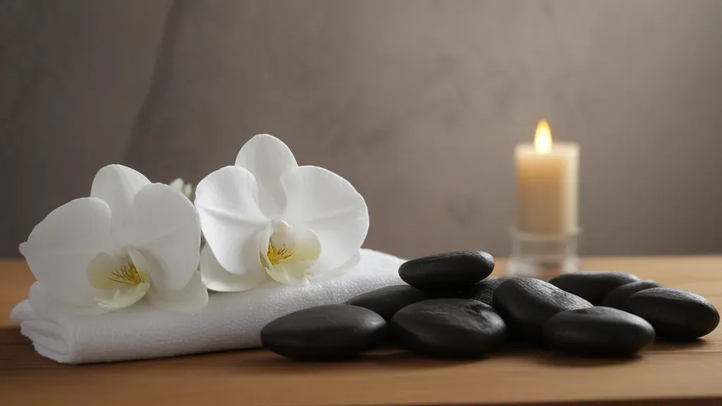 Softly lit white orchids rest on a textured white towel, surrounded by dark, rough pebbles and a warm, glowing lit candle, creating a serene spa atmosphere. The balanced composition and warm lighting enhance the tranquil setting, ideal for relaxation and meditation.