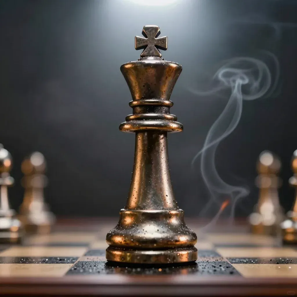A golden chess king stands upright on a smoky chessboard, its glossy metal reflecting dim light, creating a dramatic and mysterious atmosphere. The dark, blurred background enhances the depth and focus on the king, making it a striking focal point.