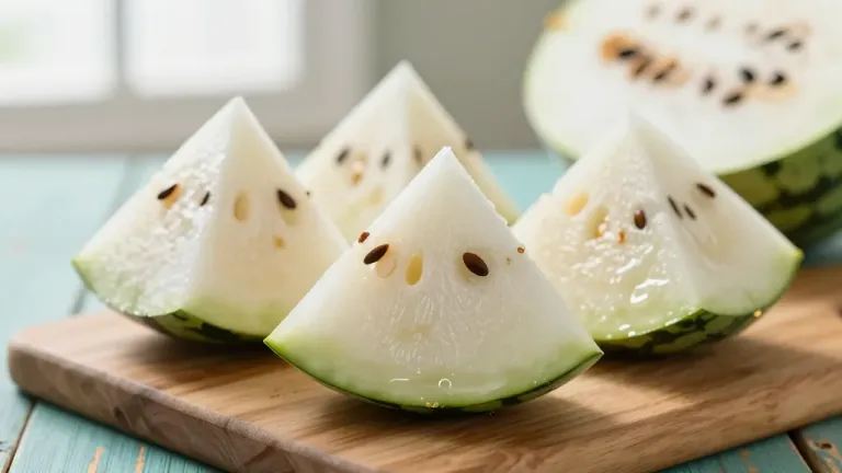 Slices of white-flesh watermelon with a soft, creamy texture and scattered seeds, illuminated by diffused natural light that creates a glossy appearance. The close-up shot with a shallow depth of field highlights the texture and details, set against a rustic wooden cutting board and light blue table.