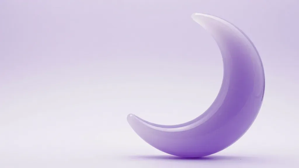 A smooth, glossy, translucent lavender glass crescent reflects soft, diffused light, creating a serene and elegant visual. The centered composition with a slight off-center crescent adds a dynamic sense of movement against a blurred, light lavender background.