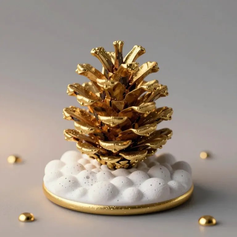 A gilded pinecone with golden scales and a glossy finish sits atop a textured, cloud-like white base, illuminated by soft, diffused light from the side, creating gentle shadows and highlights. The neutral, light gray background slightly blurs the scene, emphasizing the pinecone and base as the focal point.