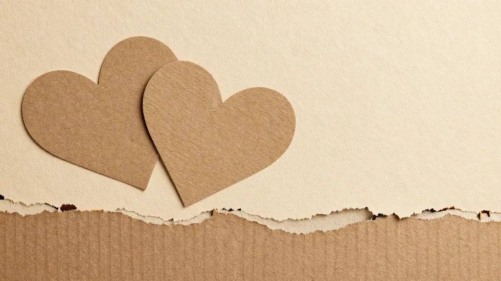 Three brown hearts cut from kraft paper are arranged on a torn edge, creating a textured, rustic aesthetic. Soft, diffused lighting highlights the edges and textures of the hearts, adding depth and dimension to the composition.