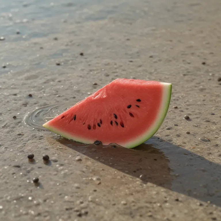 A juicy watermelon wedge rests on a sandy beach, its vibrant red flesh and pale green rind glistening under warm, golden sunlight. The shallow depth of field and close-up shot emphasize the texture and color, creating a visually striking composition.