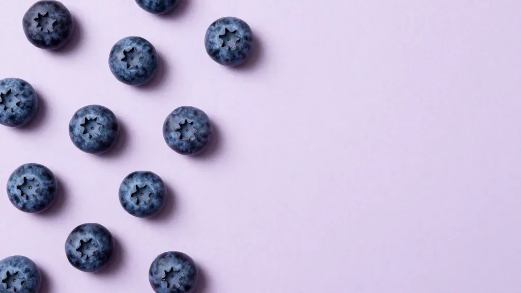 Glossy blueberries are scattered on a pale lavender background, creating a soft, diffused light effect with gentle shadows. The asymmetrical composition and negative space provide a clean, modern aesthetic suitable for branding and packaging designs.