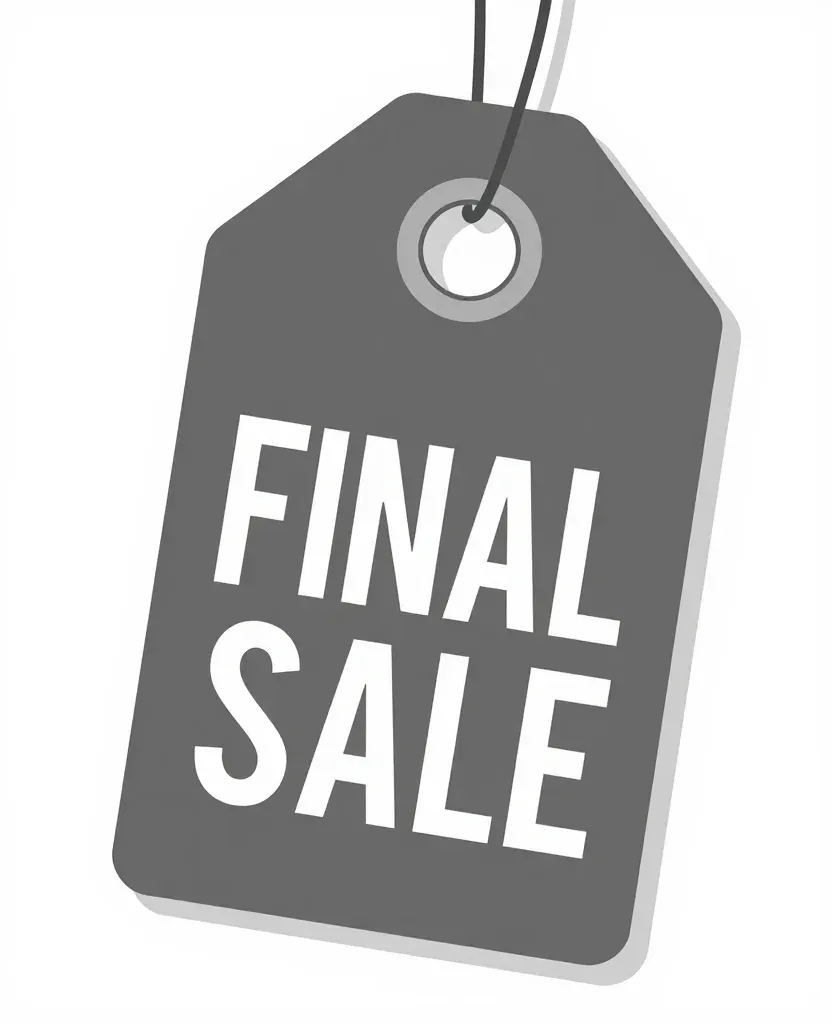 A glossy, smooth, reflective 'Final Sale' tag is centered and slightly angled, with diffused, soft lighting from above creating gentle shadows. The neutral, blurred background suggests a store or market setting, providing ample copy space for design integration.