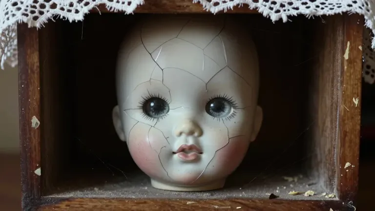 A bald porcelain doll head with visible cracks and pale pink blush rests inside a weathered wooden drawer, partially covered by frayed cream lace. Soft frontal lighting highlights the glossy surface of the doll while deep shadows and shallow depth of field isolate the subject from the dark, indistinct background.