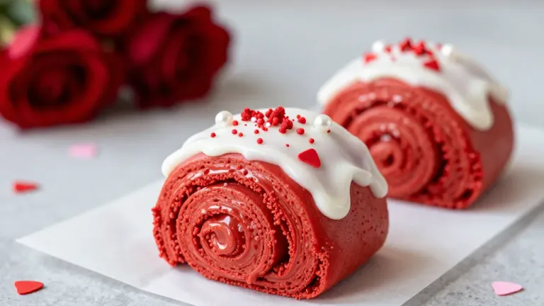 Close-up of red velvet rolls topped with white frosting and red sprinkles, softly lit to highlight the glossy texture and vibrant color, set against a blurred romantic backdrop of red roses and heart-shaped confetti, creating a shallow depth of field that draws attention to the cake's intricate details.