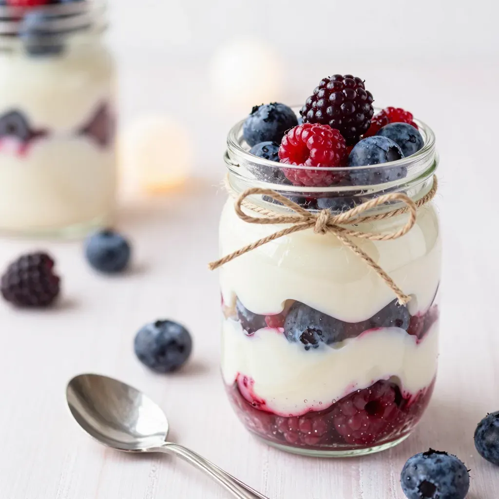 A layered berry parfait in a clear glass jar features creamy yogurt and plump, glossy blueberries, raspberries, and blackberries, tied with natural twine. Soft diffused lighting from the upper left highlights textures with shallow depth of field and a clean, minimalist background.