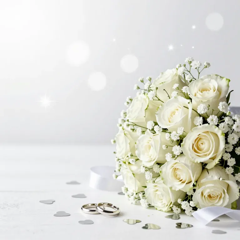 A bouquet of pristine white roses and delicate baby's breath is artfully arranged, with glossy silver heart confetti scattered below, creating a romantic and elegant scene. The soft, diffused lighting enhances the gentle glow and subtle shadows, adding depth and a dreamy quality to the composition.