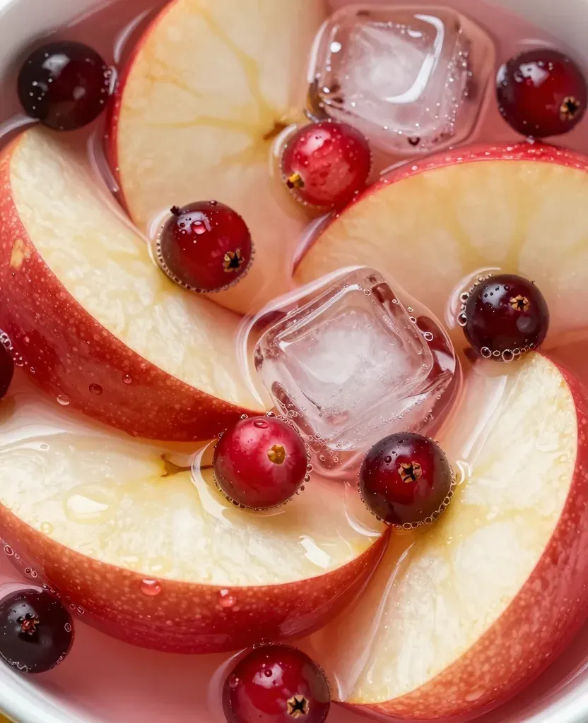 Apple slices, cranberries, and ice cubes float in a viscous pink liquid, their glossy surfaces reflecting soft overhead light. The tight top-down composition with shallow depth of field emphasizes the central arrangement against a blurred white bowl interior.