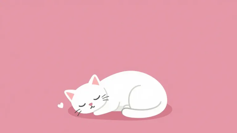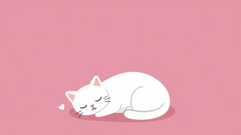 A white cartoon kitten curls into a peaceful nap, its eyes closed and cheek adorned with a tiny heart-shaped blush, rendered in soft, velvety fur. The image features diffused lighting from the upper left, casting gentle highlights and a soft shadow beneath, with a solid pink background providing clean, minimal negative space.