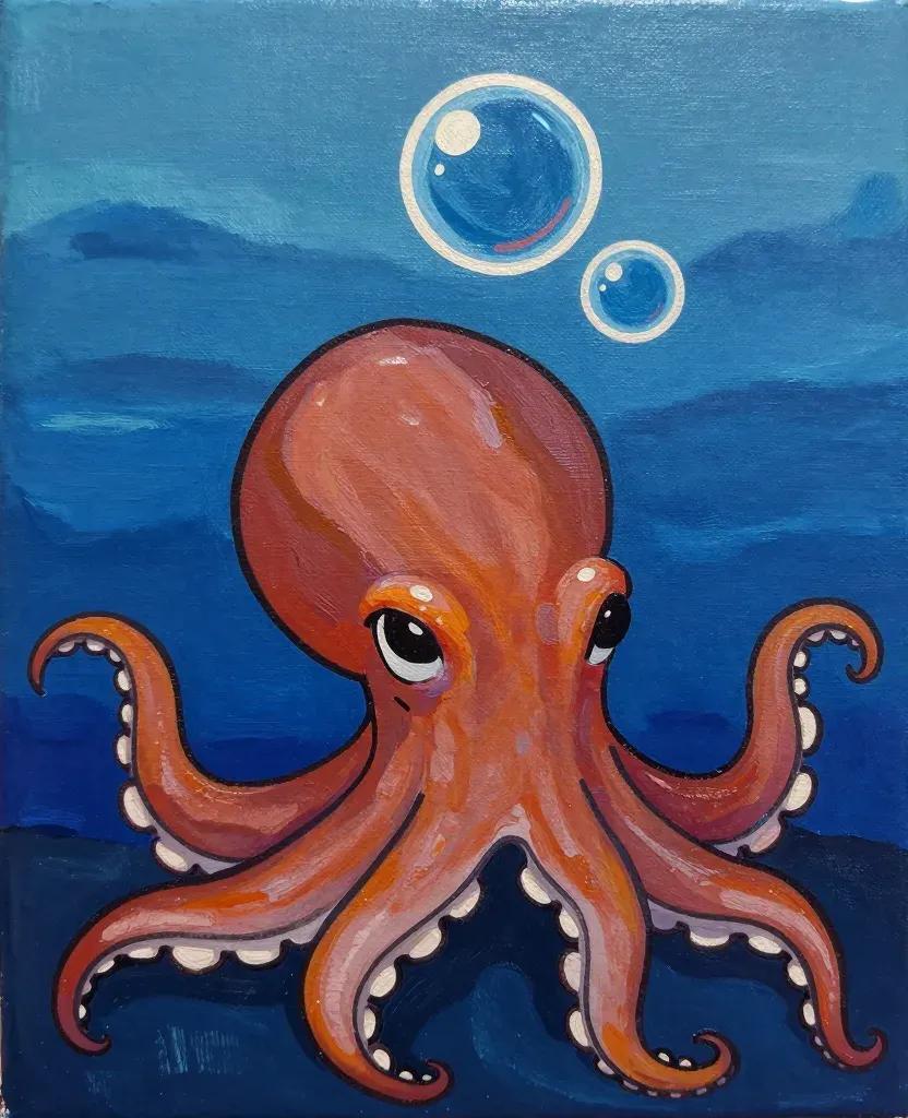 A glossy octopus with reddish-orange tentacles and small white suction cups is depicted against a deep blue gradient background, with soft diffused light highlighting its translucent appearance. The composition is centered, emphasizing the octopus and bubbles, creating a serene underwater scene.