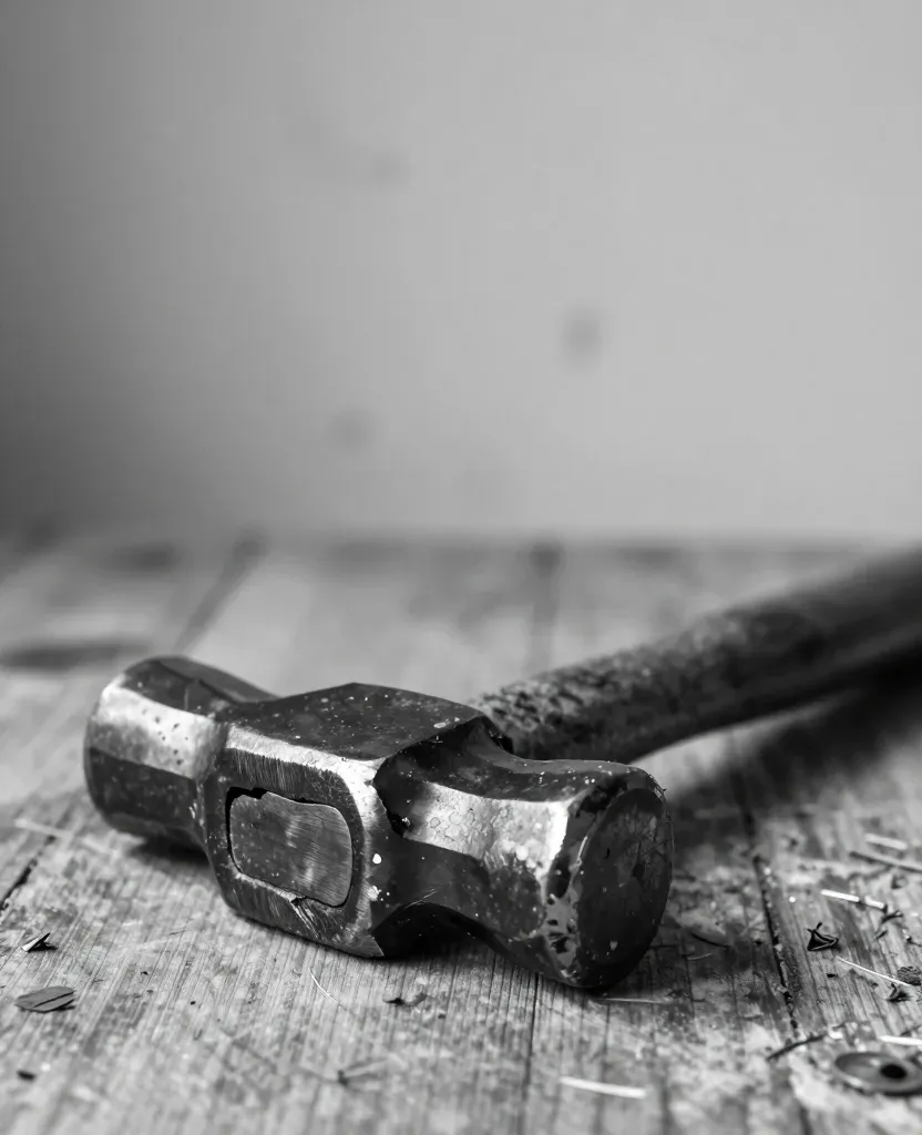 A close-up of a worn hammer with a textured metal head and a wooden handle resting on a grainy wooden surface, illuminated by soft, diffused light that creates gentle shadows and highlights, emphasizing the hammer's rugged texture and the natural grain of the wood beneath it.