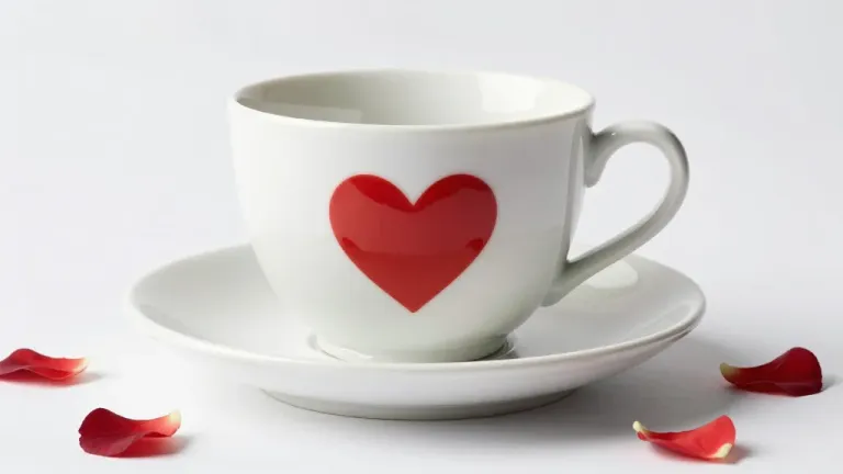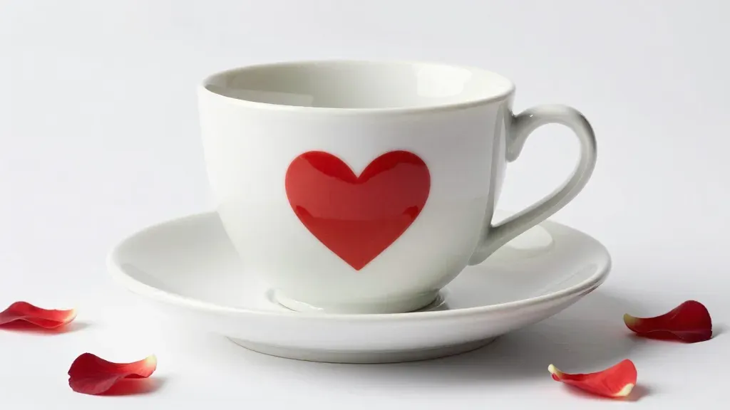 A white porcelain teacup featuring a bold red heart design rests on a matching saucer, surrounded by scattered dry rose petals with a satin finish. Soft high-key studio lighting from the upper left creates gentle highlights and shallow depth of field, emphasizing the cup while the clean grey background provides ample copy space.