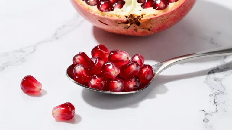 Glossy pomegranate seeds glisten on a spoon, set against a soft, diffused light that highlights their vibrant red hue. The clean white marble background provides a minimalist backdrop, emphasizing the seeds' plump texture and the spoon's reflective surface.
