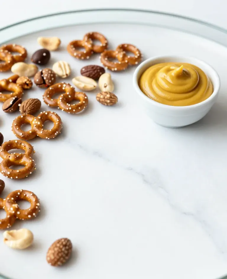 Scattered pretzels and nuts with a creamy mustard in a white bowl, illuminated by soft, diffused light that highlights the textures and warm tones, creating a minimalist and inviting arrangement on a clean white marble surface.