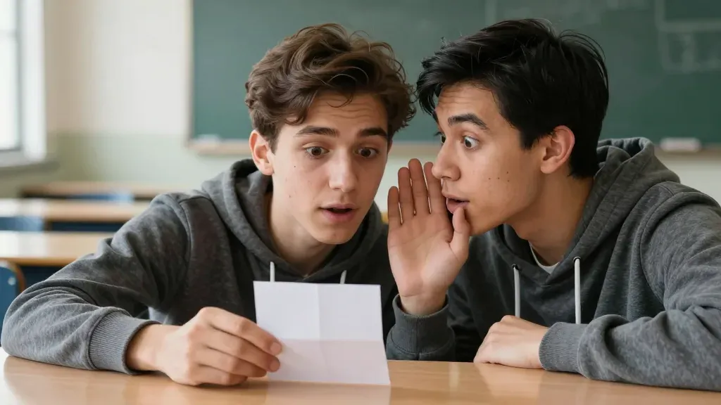 Two students in gray hoodies share a secret note in a classroom setting, with soft natural light highlighting their expressions and the glossy desk surface. The shallow depth of field keeps the focus on the students, while the blurred background of desks and a chalkboard adds to the intimate atmosphere.