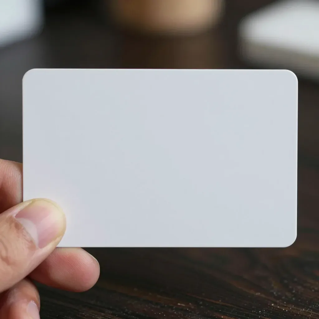 A close-up of a hand delicately holding a smooth, glossy white credit card, with soft, diffused lighting creating gentle shadows. The shallow depth of field isolates the hand and card, emphasizing their textures and the warm brown background adds depth and context.