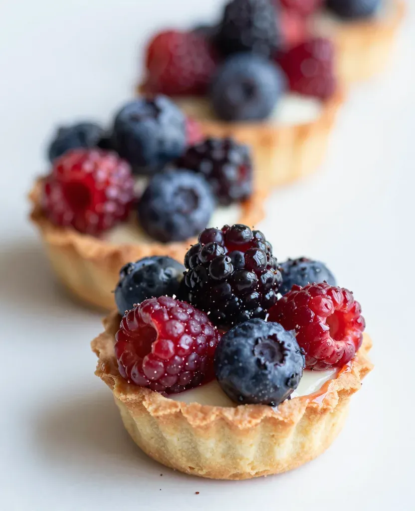 Three fluted pastry tartlets topped with plump raspberries, blueberries, and blackberries, showcasing velvety, waxy, and bumpy textures under soft natural light. The shallow depth of field emphasizes the foreground tartlet against a clean white background with ample copy space.