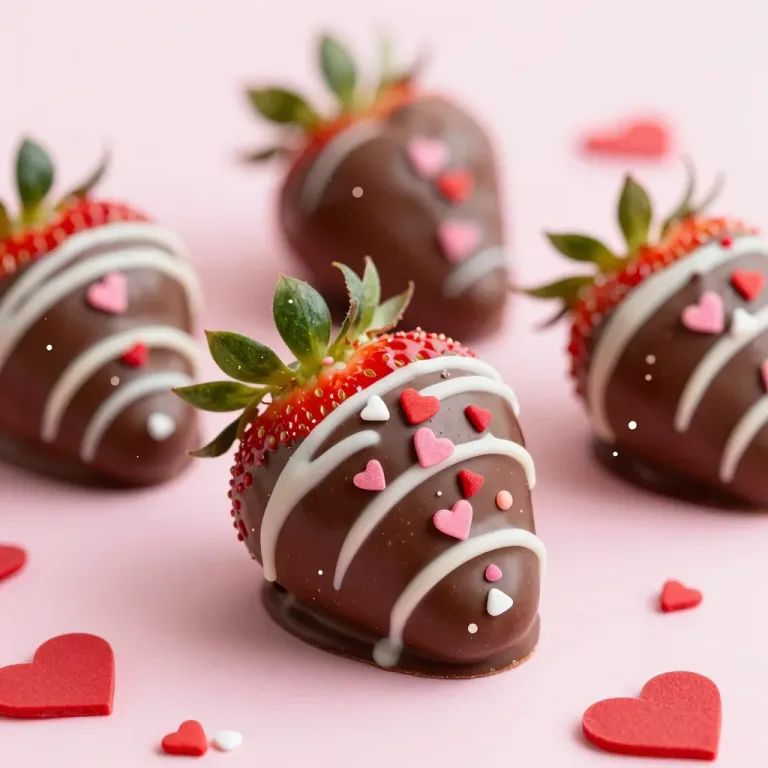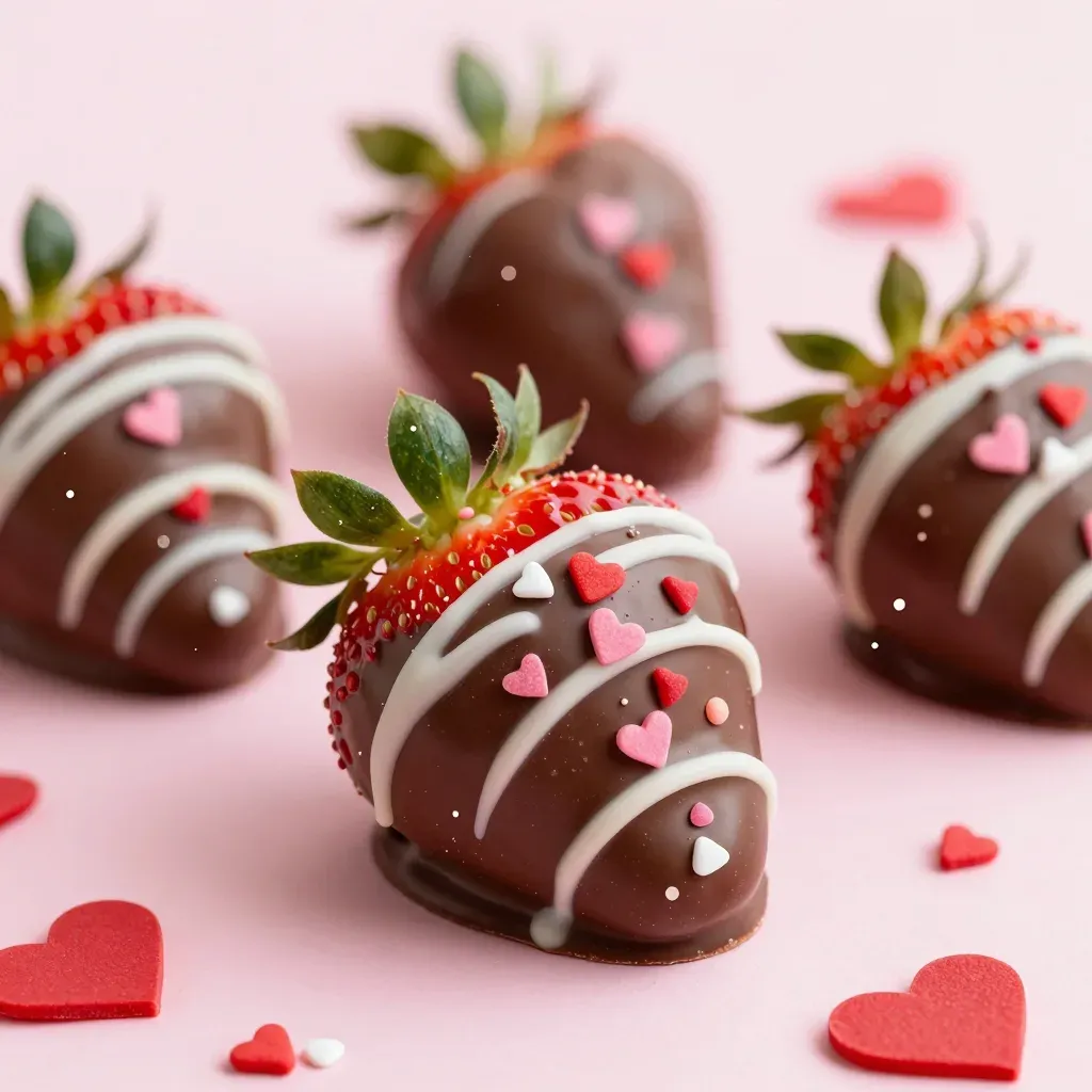 Glossy dark chocolate-coated strawberries adorned with white drizzle and pink heart sprinkles, showcasing a smooth, rich texture contrasted with the natural roughness of the fruit. Soft diffused lighting highlights the curves of the chocolate with shallow depth of field and a clean pastel pink background providing visual focus and copy space.