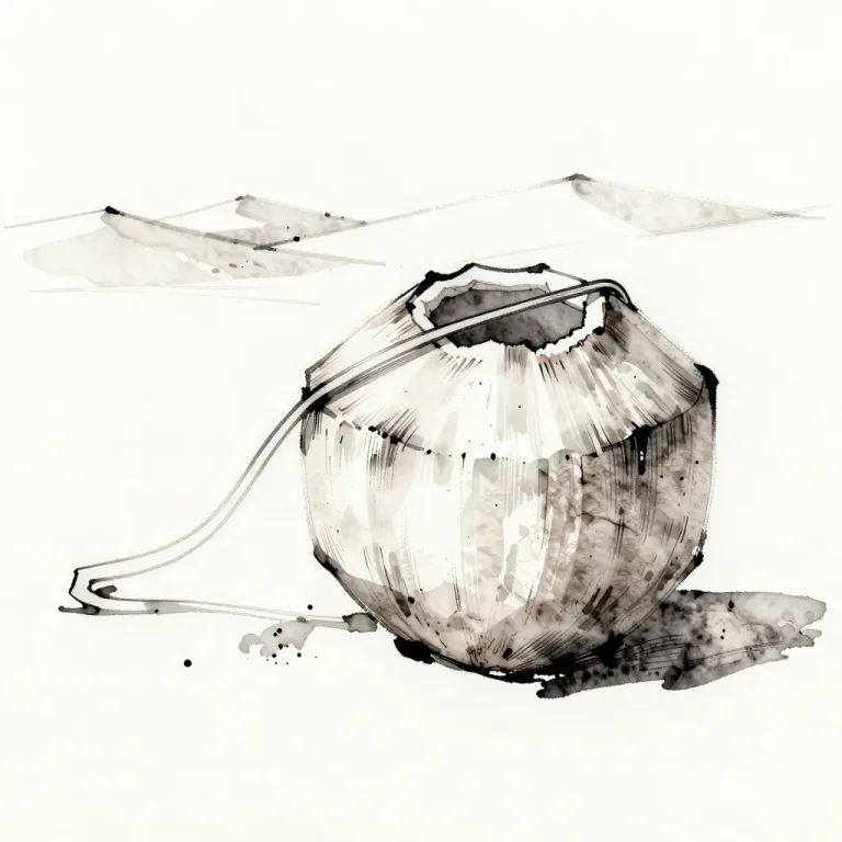 A monochromatic image of a coconut with an open top, revealing a dark interior, bathed in diffuse, soft light that highlights the glossy surface and creates subtle shadows. The composition is centered, with wispy lines surrounding the coconut, emphasizing its texture and form against a blurred background.