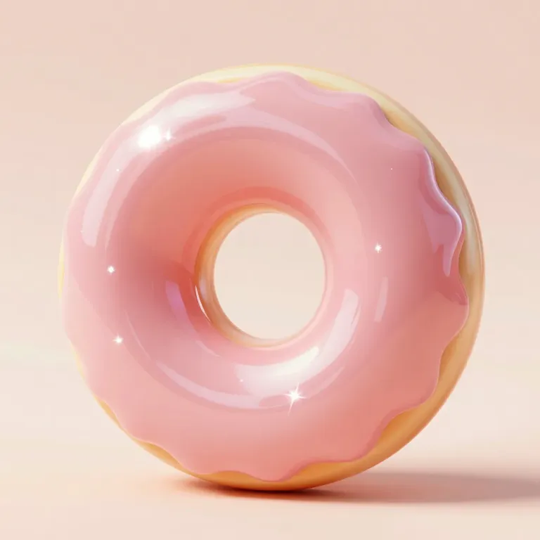 A close-up of a glossy pink donut ring with a creamy, dripping glaze and a golden-brown base, illuminated by soft, diffused light from above, creating highlights and a gentle glow. The shallow depth of field and minimal background distraction make it ideal for product photography and food styling.