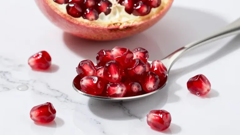 Juicy pomegranate seeds glisten on a reflective spoon, set against a clean white marble background. The soft, diffused lighting highlights the vibrant red seeds and creates a shallow depth of field, focusing attention on the spoon and seeds.
