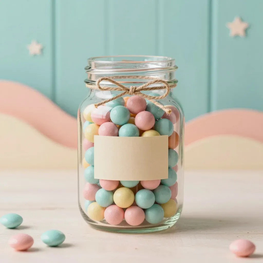 A glass jar filled with glossy, pastel-colored candies spills slightly onto a wooden surface, creating a sense of abundance under soft, diffused lighting. The blurred mint green wall with star decorations in the background adds a playful and nostalgic charm.