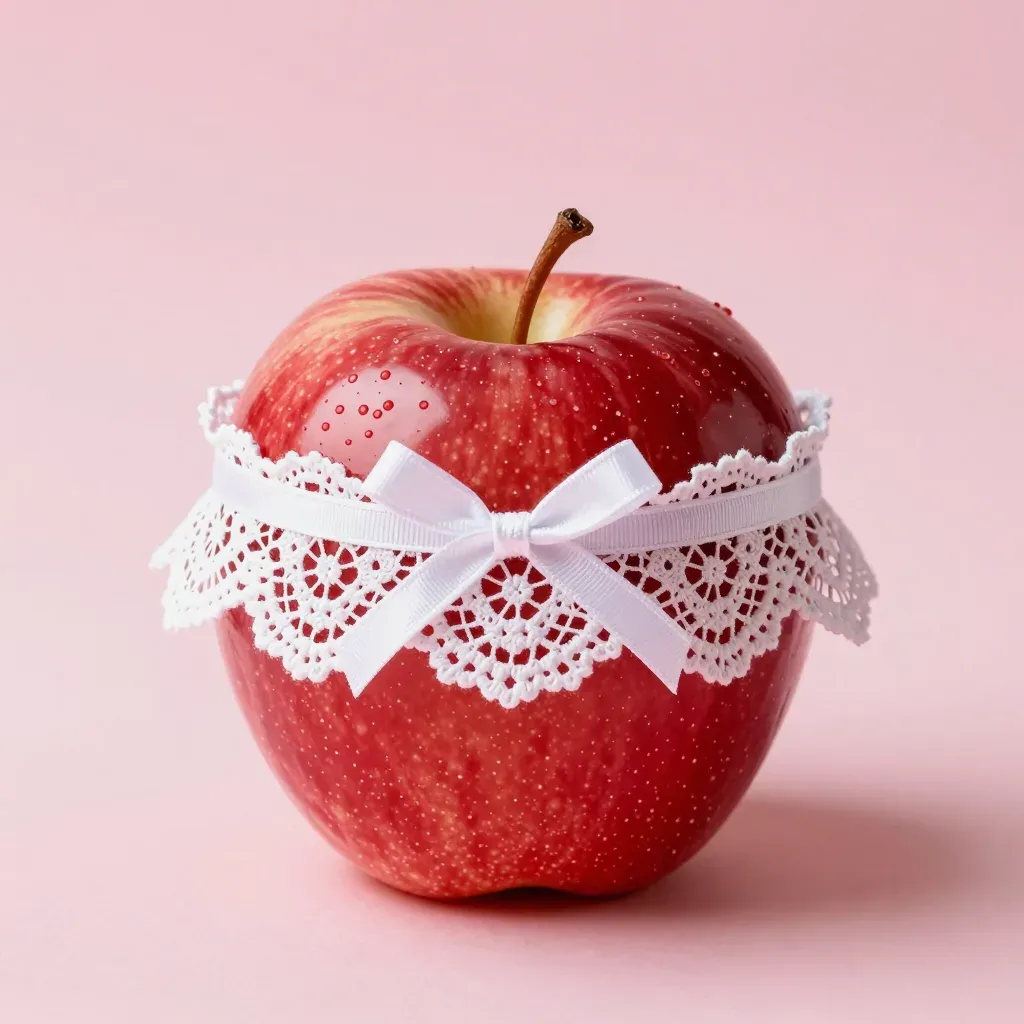 A glossy red apple is elegantly decorated with a white lace collar and bow, softly illuminated to highlight its texture and the delicate lace. The blurred pink background creates a clean and simple backdrop, emphasizing the apple's refined appearance.