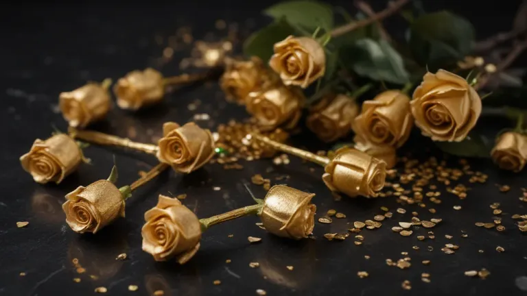 Golden roses with velvety petals and rough gold dust scattered on a dark, reflective surface, illuminated by warm, directional light that highlights the petals and dust. The shallow depth of field creates a blurred background, emphasizing the roses and creating a luxurious, intimate atmosphere.