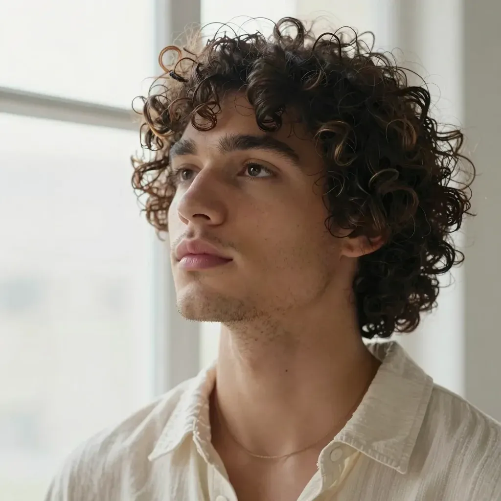 A person with curly hair and a light, airy white shirt is captured in a close-up shot, with soft, diffused light highlighting the texture of their hair and the shirt. The shallow depth of field blurs the background, creating a clean and focused composition.
