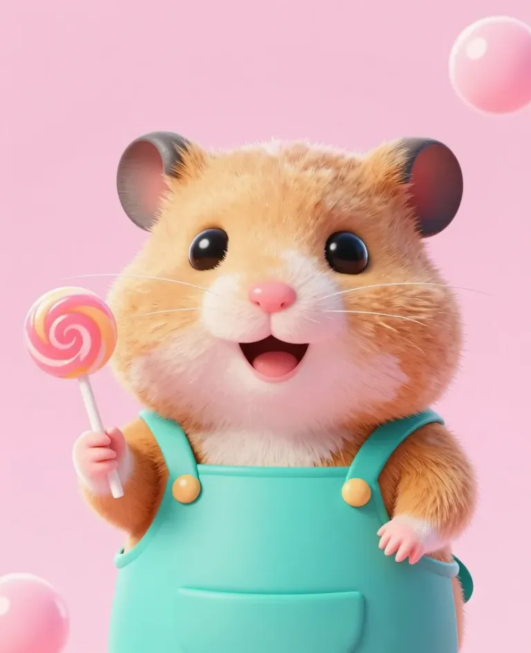 A fluffy golden-brown hamster in turquoise overalls holds a swirled pink-orange lollipop, its soft fur and glossy candy catching a warm, diffused light. The centered, eye-level composition with shallow depth of field and floating bokeh bubbles creates a whimsical, studio-style fantasy scene.