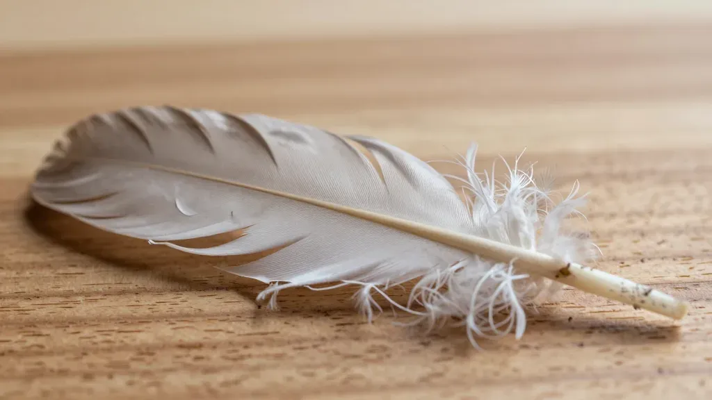A close-up of a white feather with barbs at the tip, resting on a natural wood surface, illuminated by soft, diffused light that highlights the feather's texture and glossy shaft. The shallow depth of field draws attention to the feather, creating a serene and minimalist composition.