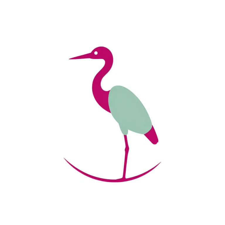 A flat digital illustration of a heron standing on one leg, with a teal body and magenta accents, set against a light gray background. The uniform, flat lighting and centered composition create a clean and modern look, ideal for branding and digital interfaces.