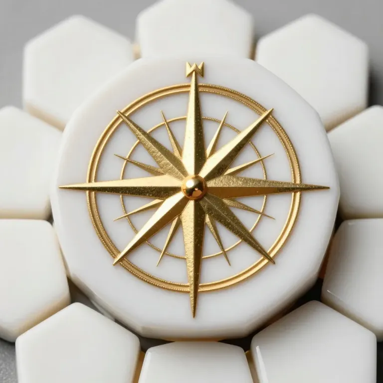 A golden compass emblem shines with intricate details against a backdrop of white hexagonal tiles, softly lit to highlight its reflective surface. The shallow depth of field draws attention to the emblem's central focus, offering ample copy space for design integration.