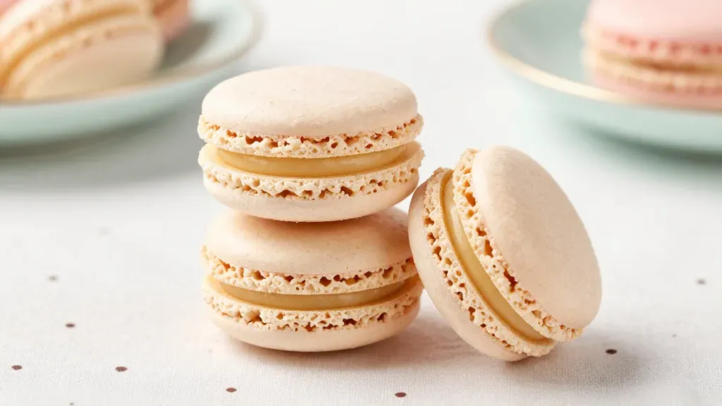Soft pastel pink macarons stacked in a pyramid, glossy shells and creamy filling, highlighted by diffused light. Shallow depth of field keeps focus on the macarons against a light, polka-dotted background.