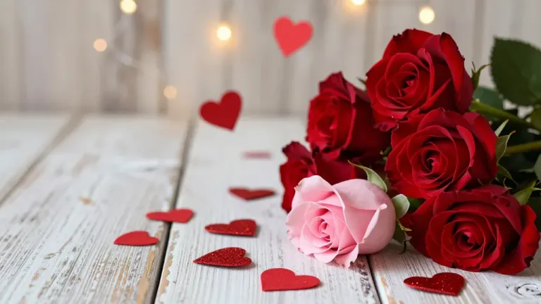 A close-up of a bouquet of red roses with scattered rose petals and hearts, set against a rustic white wooden table with diffused, warm string lights creating a romantic ambiance. The shallow depth of field blurs the background, emphasizing the bouquet and creating a soft, intimate feel.